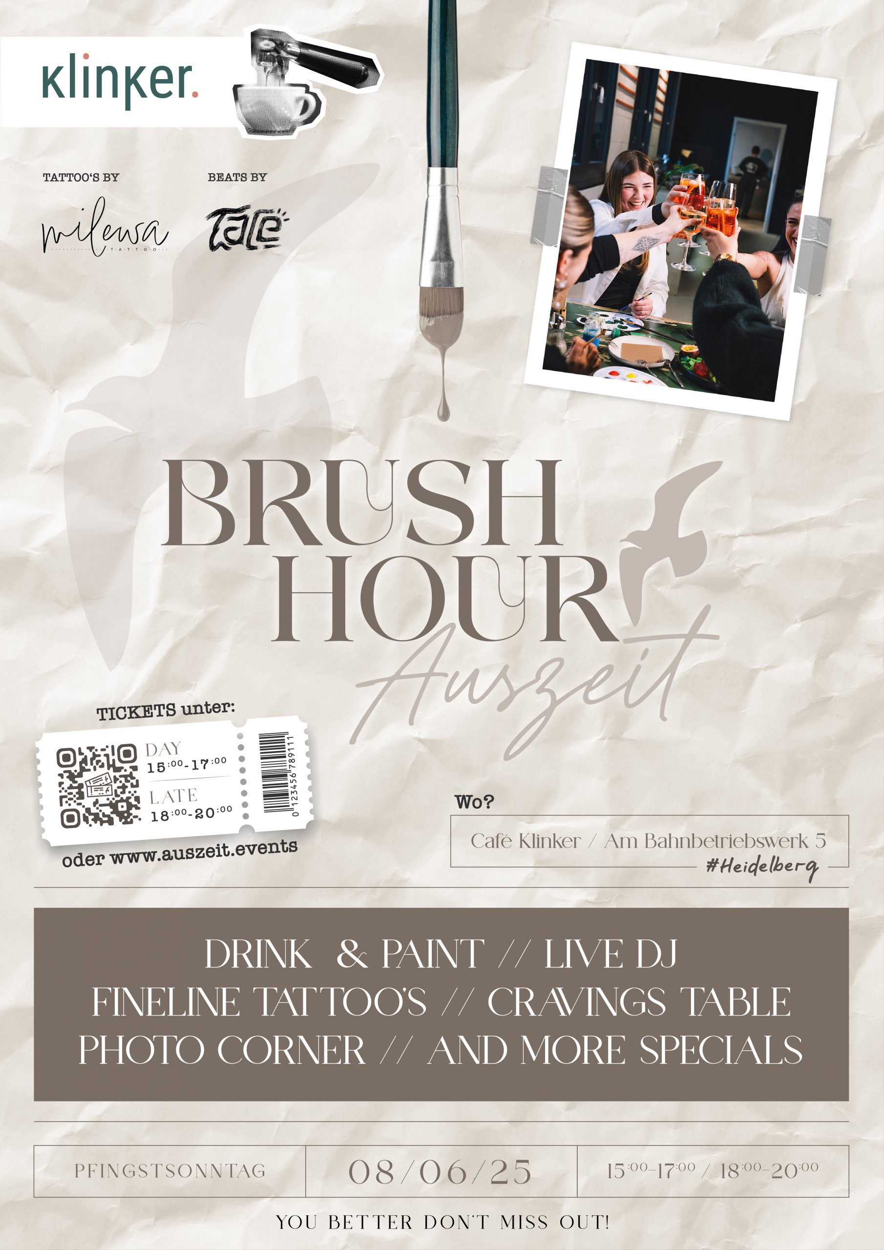 Brush Hour bringt Kunst, Musik, Drinks und kreative Überraschungen in einem einzigartigen Format zusammen. Kein klassisches Event – sondern ein Gefühl, das dich direkt in den Moment holt. Das Ganze findet im Café Klinker Heidelberg statt – gemütlich, stilvoll, voller Charme. Die perfekte Kulisse für eine kreative Pause mit Flow.